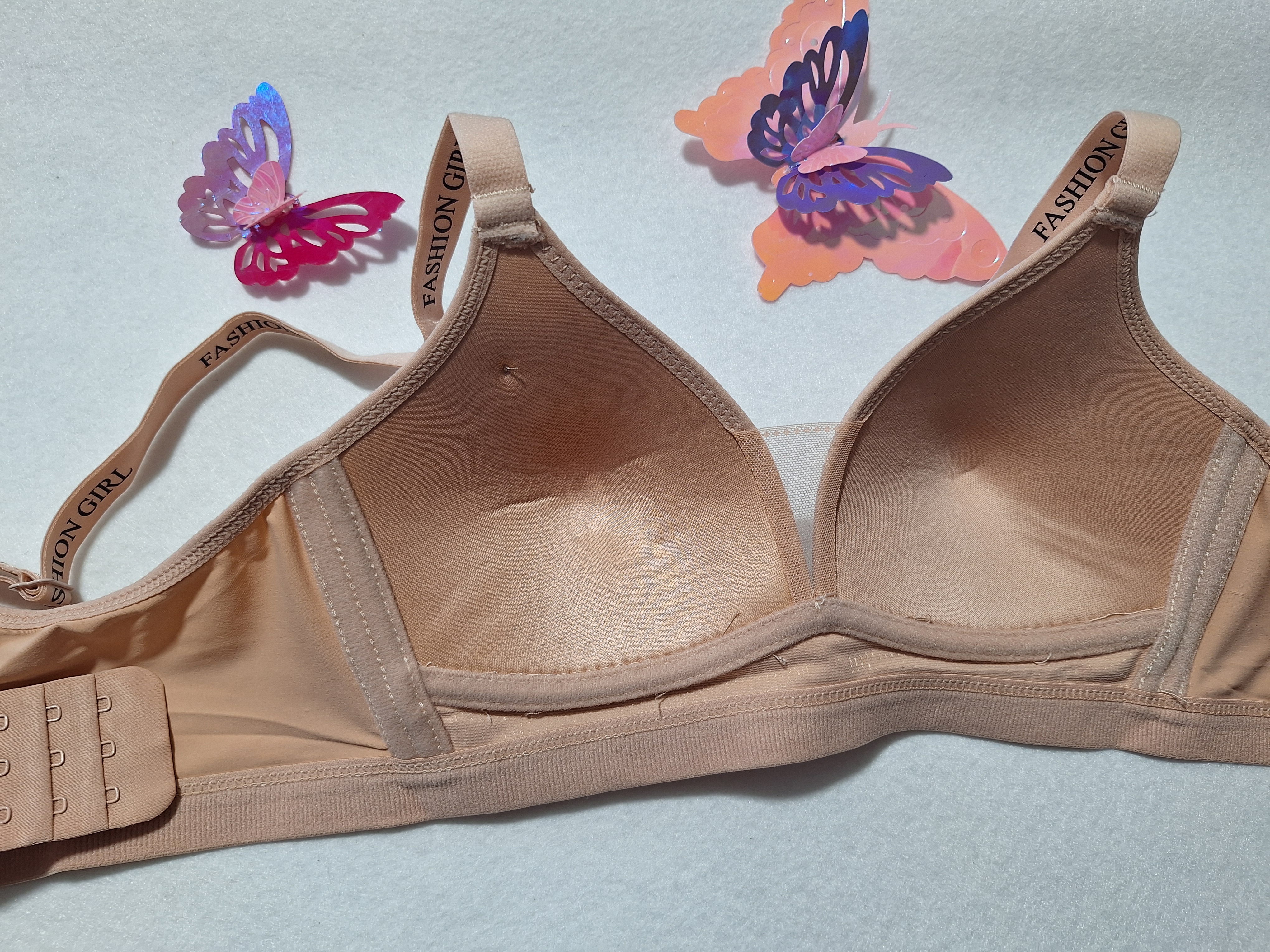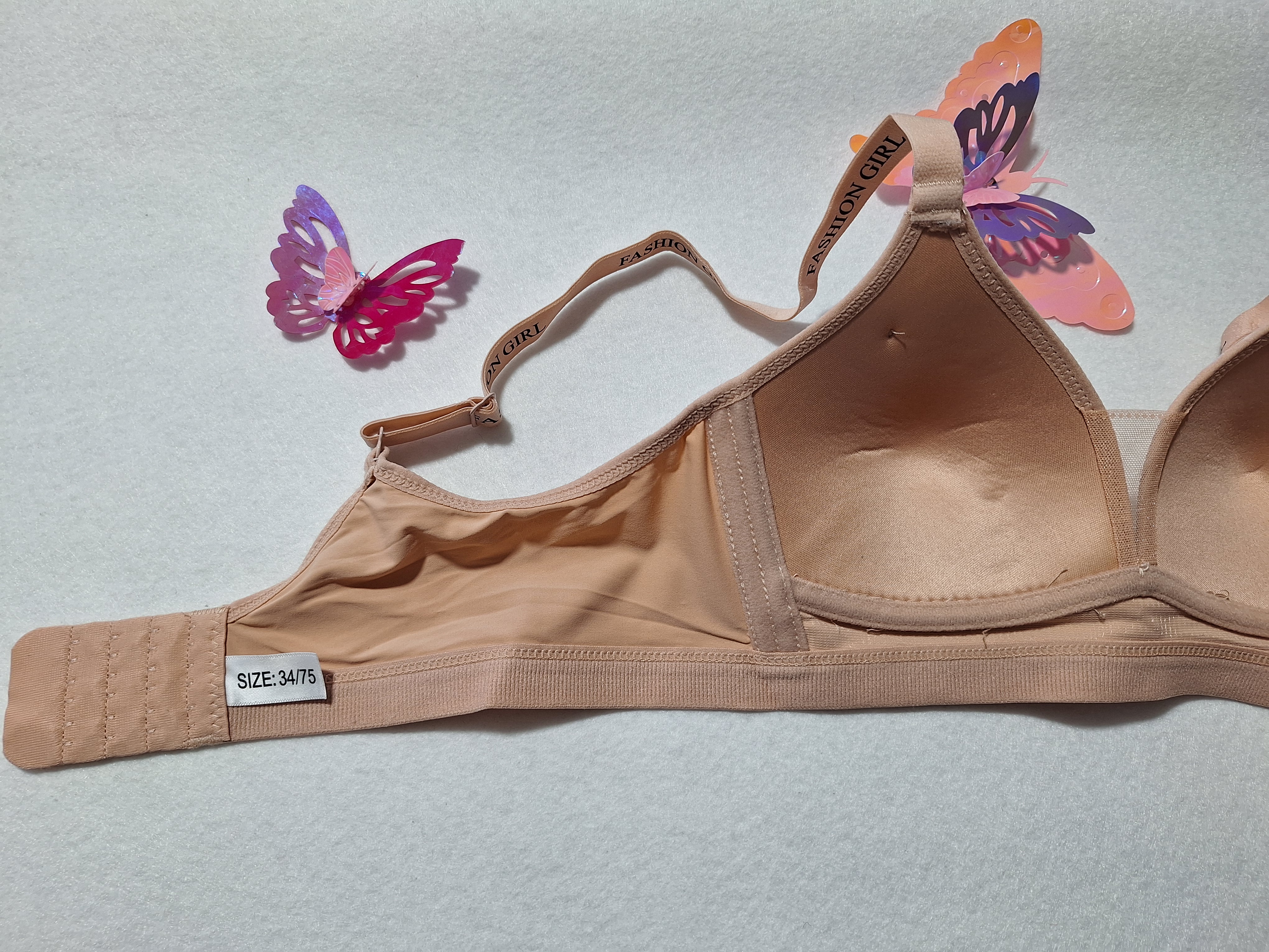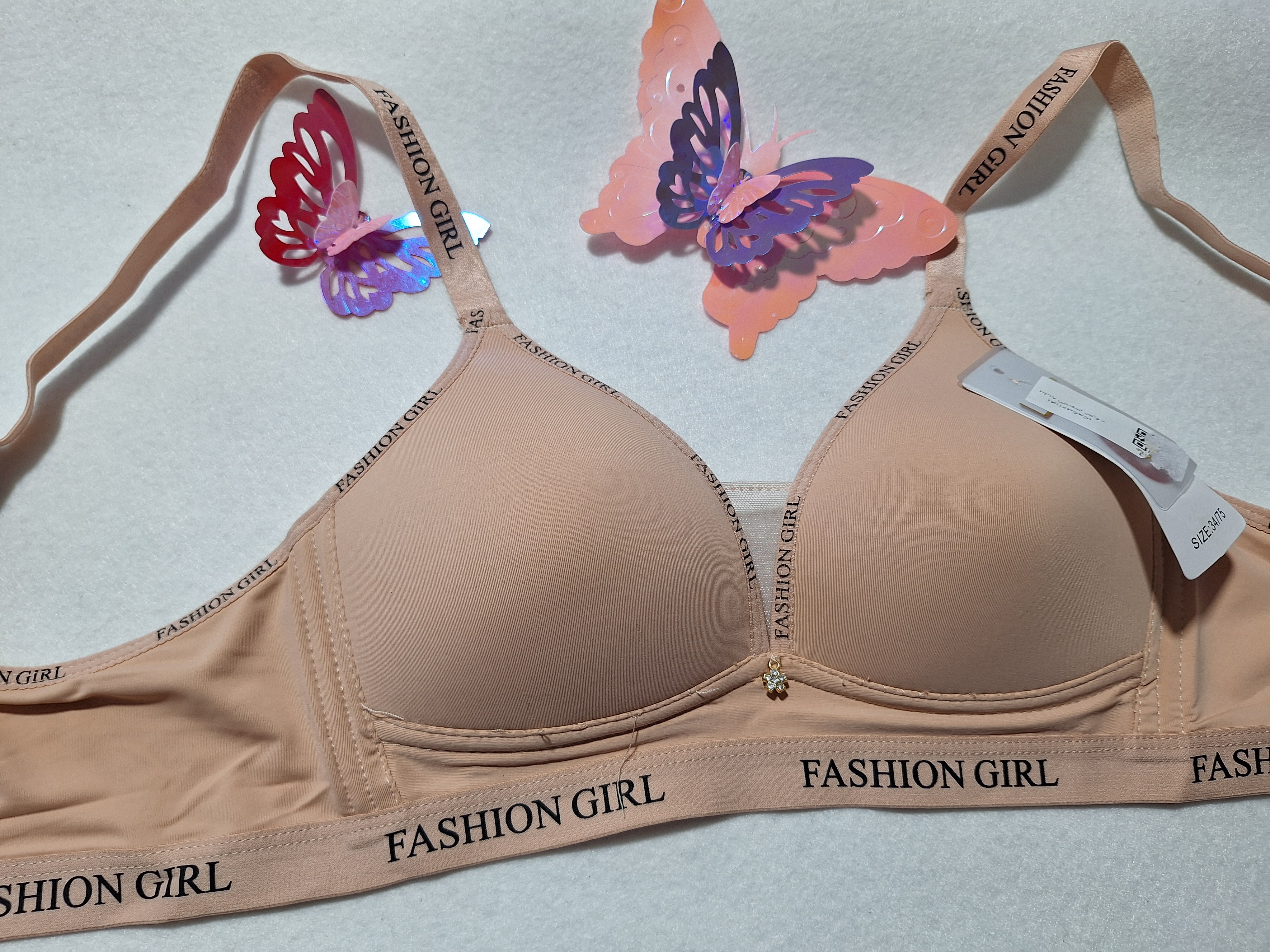 سوتین اسفنجی بدون فنر کش پهن طرح دخترانه که روی کش پلیین و سته ها چاپ انگلیسی داره